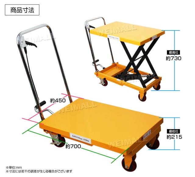【在庫処分特価】 油圧式 リフトテーブル 台車 運搬台車 リフト 足踏式 油圧 積載荷重150kg 昇降台車 テーブル高さ最大730mm
