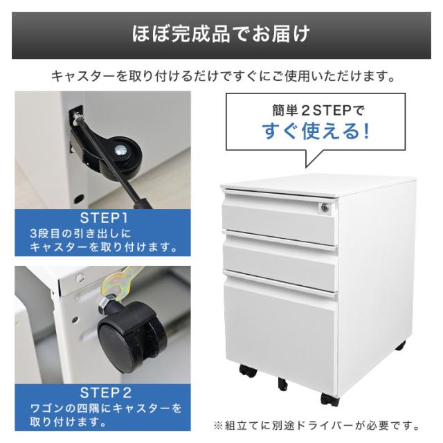- 自宅用に、オフィスで使うようなタイプのワゴンが欲しかったので購入しました。 金属製でかなり重たいですが、キャスター付きなので移動しやすく便利です。 引き出しの開閉音も比較的静かです。(閉まる直前にストッパー?が機能するおかげでイヤな音がしません) 自身で組み立てる手間が省けて助かりました。