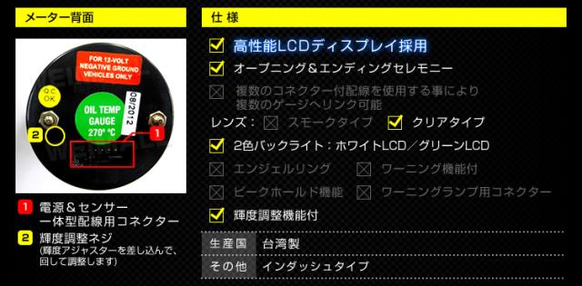 | 商品仕様 | メーター径52mm 2色バックライト:ホワイトLCD/グリーンLCD ※インダッシュ・タイプ |