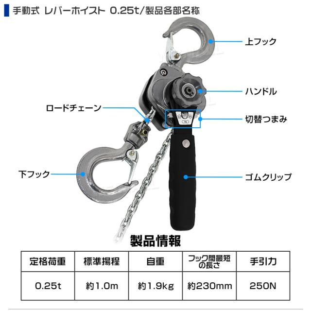 レバーホイスト 250kg (0.25ton) チェーンホイスト 手動式 荷締機 荷締め 荷締め機 レバー ホイスト ジャッキ チェーン ガッチャ チェンブロック チェーンブロックA20B025