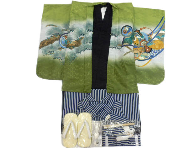 七五三 男の子 四ッ身 5歳 着物 9点セット グリーン地 兜柄 No.3151