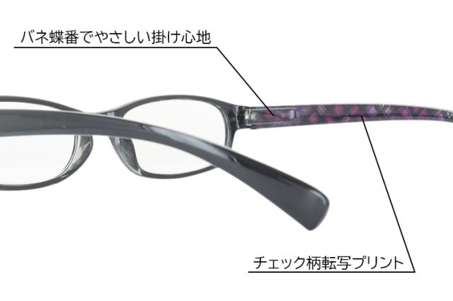 | ●フレームカラー チェック柄転写プリント ●レンズカラー クリア | ●素材 フレーム:ポリカーボネート テンプル:ポリカーボネート レンズ:アクリル ●度数 +1.00、+1.50、+2.00、+2.50、+3.00、+3.50の5度数展開。 ●重量 約19g |