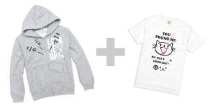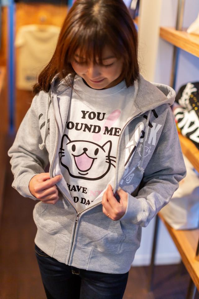 パーカー「LOOK ME UP!」と一緒に着ると、ニャーニャー鳴き声のするパーカーのジッパーを下すと、このTシャツの顔が出てくる、とってもとっても楽しい仕掛けが完成します!