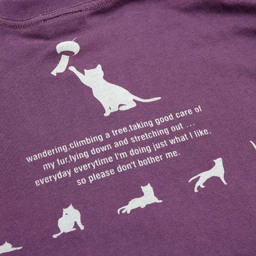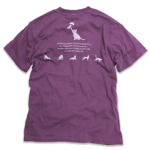 | ■ おさんぽねこ(ムラサキ) 気ままにお散歩中の、歩いたり、飛んだり、掻いたり、寝転んだり、ノビしたり...そんなポーズをフィーチャー! 背中には英文で「気ままに散歩してるんだから構わないで!」って書いてあります。 このTシャツは、和柄プリントによく用いられる抜染プリントというTシャツ生地の色を抜く特殊な方法でプリントしています。 なので、一般のプリントに比べて肌触りも風合いも柔らかです。そして、なんとも和柄ふうです! | |||