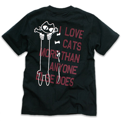 | ■ LOVE CAT(PK Ver) (ブラック) 「LOVE CAT」パーカーと共通デザインです!バックにはノビネコと一緒に「私は誰よりもネコが好き」と英文であまり目立たない色だけど、でっかくプリントされています。さりげなくネコ好きを主張したいあなたにオススメです! Tシャツには特別にもう一色ワインレッドもご用意しました。 LOVE CAT持ってるけど、違うバージョンもって方にオススメです! ※染み込みインクを使用したプリントでは、プリントの一部に小さな色むらが発生する場合がございます。 | |||
