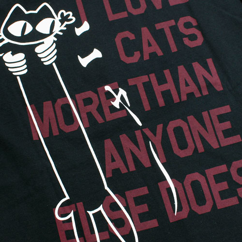 バックにはノビネコと一緒に「私は誰よりもネコが好き」と英文であまり目立たない色だけど、でっかくプリントされています。さりげなくネコ好きを主張したいあなたにオススメです!