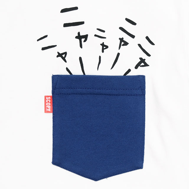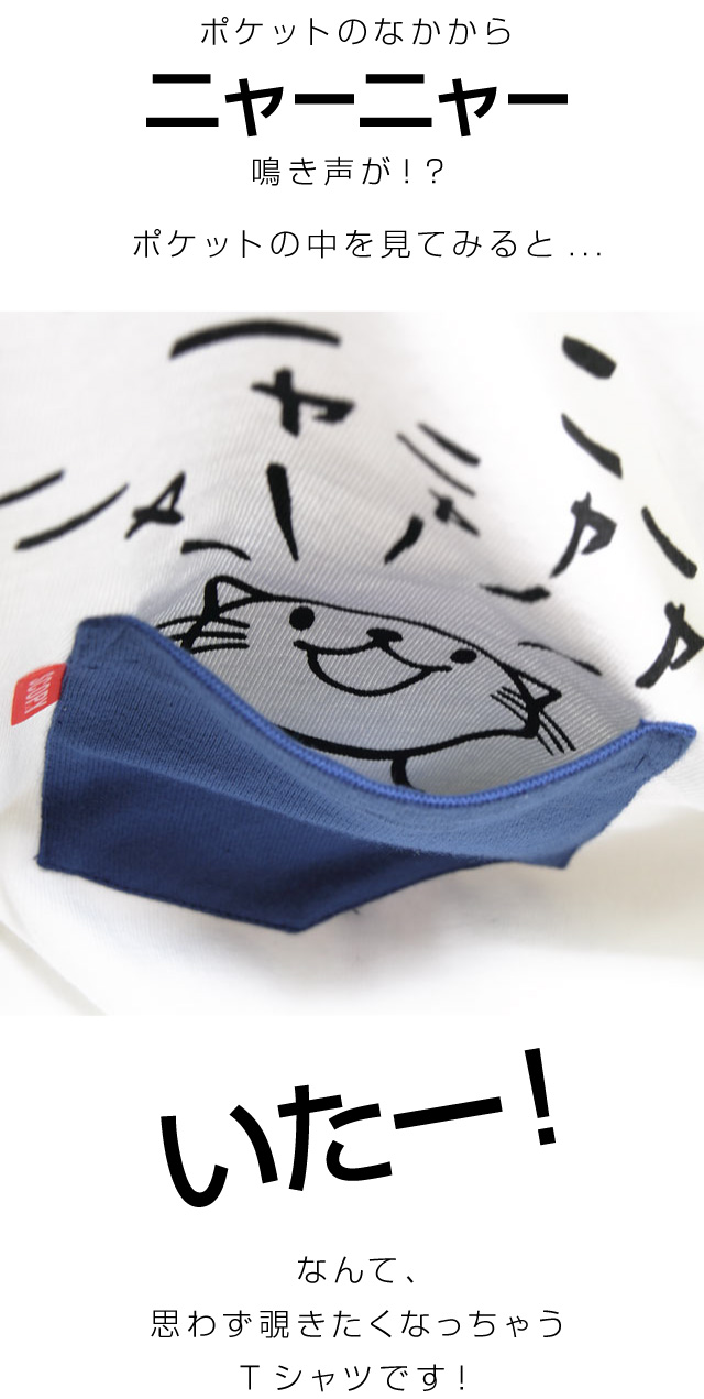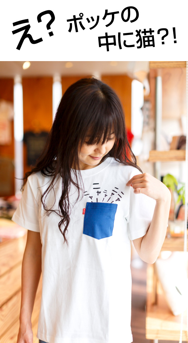 ポケットにネコを入れて連れ出そう的なTシャツです。ポケットはフェイクではなく実際に縫製で付けたポケットで、実用性もバッチシ?です。
