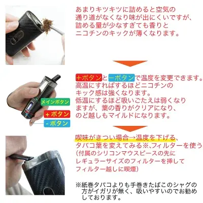 - とにかくタバコ代が安く済むので愛用しております。お手入れさえしていたら1年ぐらいは使えるのでいいお品だと思います。充電をマメにしないといけないのが難点かな。これからも使い続けると思うので無くならないで...