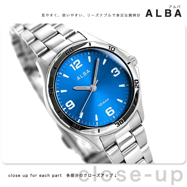 正規品 7年保証キャンペーン セイコー アルバ クオーツ レディース 腕時計 AQQK409 SEIKO ALBA アナログ ブルー ◆アルバは、スタンダードなデザインからスポーティなデザインまで、幅広い年齢層に向けたクオーツウォッチを展開。見やすさと使いやすさに加え、それぞれのシーンにあった飽きのこないデザインが魅力です。 視認性の良さと10気圧防水で実用性ばっちり。ルミブライト針付きで、暗闇でも時刻の確認が可能です。カジュアルスタイルにはもちろん、スーツやジャケットにもあわせていただけ、仕事での使用にもおすすめです。ペアウォッチとしても、プレゼントにもおすすめです。 発売日:2019年11月発売