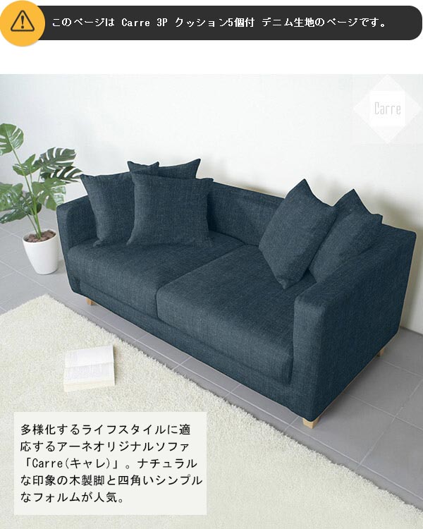 デニム ソファ カバーリング 3人掛け カバーリングソファ 3人がけソファー クッション5個付 Carre 3P □