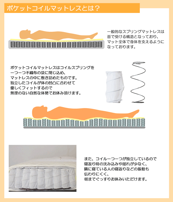■主材/2mmポケットコイルスプリング(コイル数/SS:434 S:496 SD:589 D:682)、ウレタン、ポリエステル綿混合張り地、両面多針キルティング加工