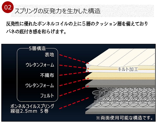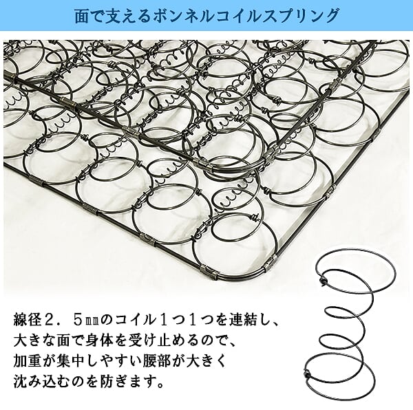 ■主材/2.5mmボンネルコイルスプリング(コイル数/SS:192 S:216 SD:264 D:312)、ウレタン、フェルト、ポリエステル綿混合張り地、両面多針キルティング加工