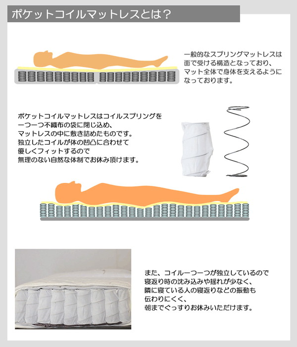 ■主材/2.0mmポケットコイルスプリング(コイル数/SS:420 S:450 SD:570 D:660)、ウレタン、フェルト、ポリエステル綿混合張り地、両面多針キルティング加工