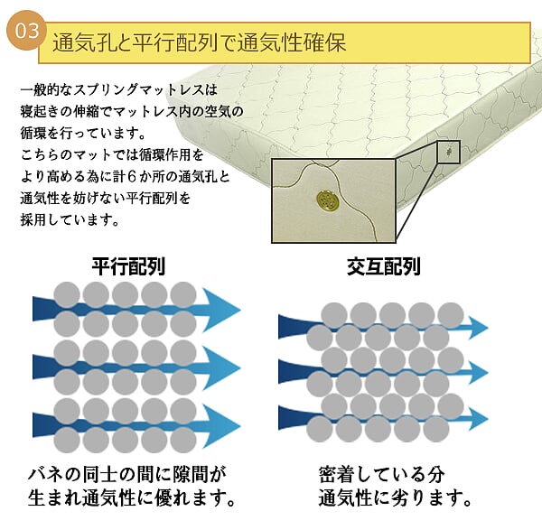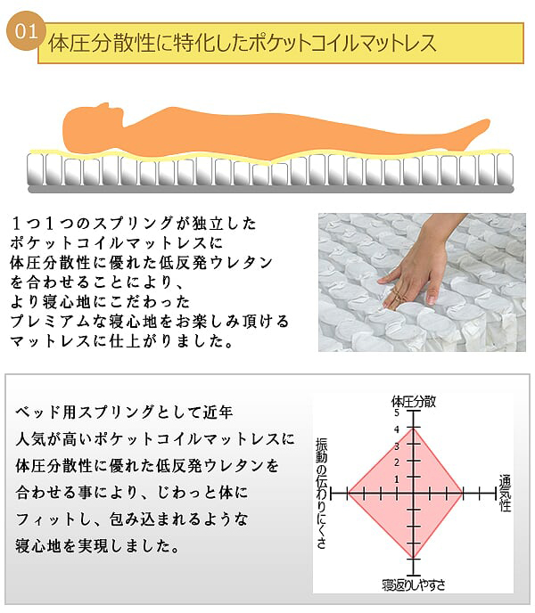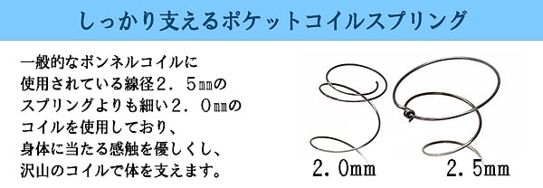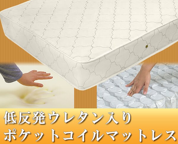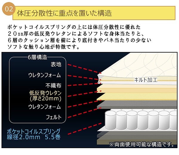 ■主材/2mmポケットコイルスプリング(コイル数/SS:403 S:496 SD:589 D:682)、30t厚低反発ウレタン、ウレタン、ポリエステル綿混合張り地、両面多針キルティング加工