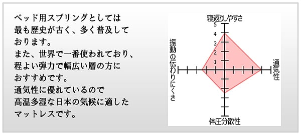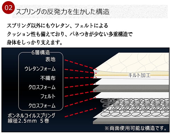 ■主材/2.5mmボンネルコイルスプリング(コイル数/ SS:192 S:216 SD:264 D:288)、ウレタンフォーム、フェルト、ポリエステル綿混合張地、両面多針キルティング加工