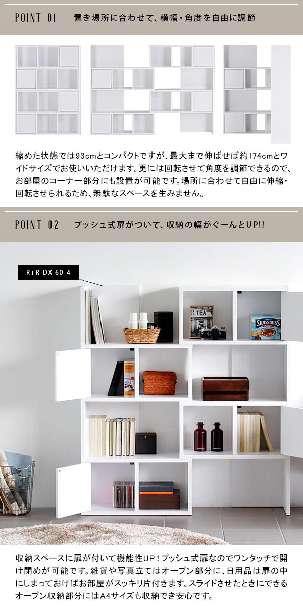 オープンシェルフ 4段 マガジンラック おしゃれ 北欧 扉付き 本棚 ディスプレイシェルフ 収納 ラック 伸縮 R+R-DX 90-4 ☆