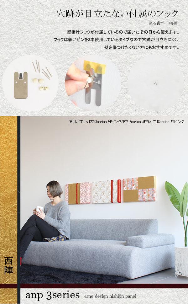 壁面への取り付けは取扱説明書をよくお読みの上、付属の壁掛け用フックをお使いください。付属のフックは石膏ボード壁専用です。またフック1個につき壁に押しピンを6本差し込んで固定するタイプです。パネルの落下により発生した損害に対して当店は一切責任を負いかねますので、十分ご検討の上ご使用いただきますようお願い申し上げます。