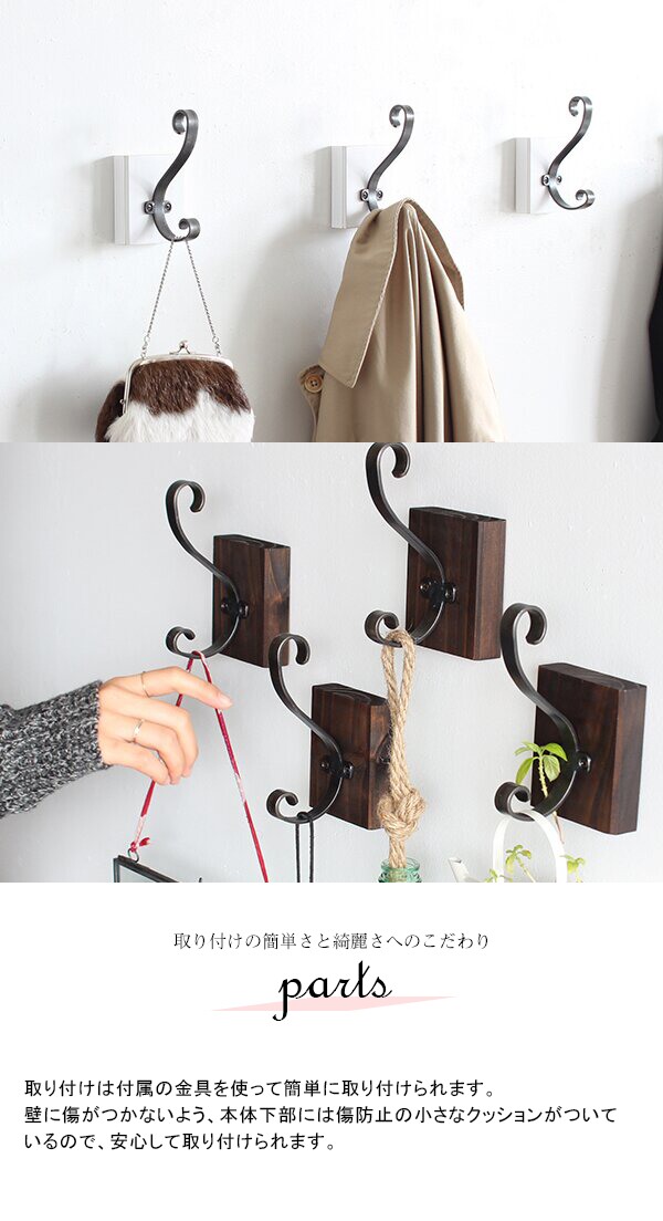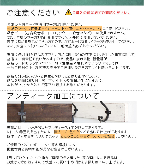 ※壁面への取り付けは、付属の壁掛け用フックをお使いください。付属のフックは石膏ボード壁専用です。またフック1個につき壁に押しピンを6本差し込んで固定するタイプです。壁面に取り付けた商品の落下や商品に掛けた物の落下により発生した損害に対して当店は一切責任を負いかねます。