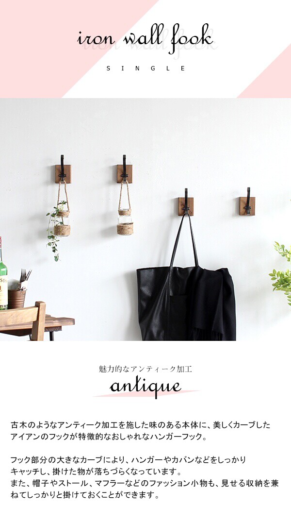 アイアンフック ウォールフック 壁掛け アイアン フック アンティーク コートハンガー 壁面 ラック スリム 収納 おしゃれ 古木 シングル 1個 Iron Hook Single ▼
