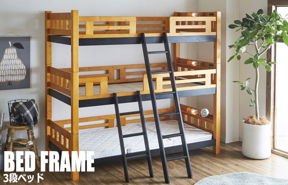 Bed 3段ベッド (ベッド 三段 木製 コンセント付き 照明 ライト 子供部屋 キッズ ナチュラル シンプル 北欧 カジュアル)