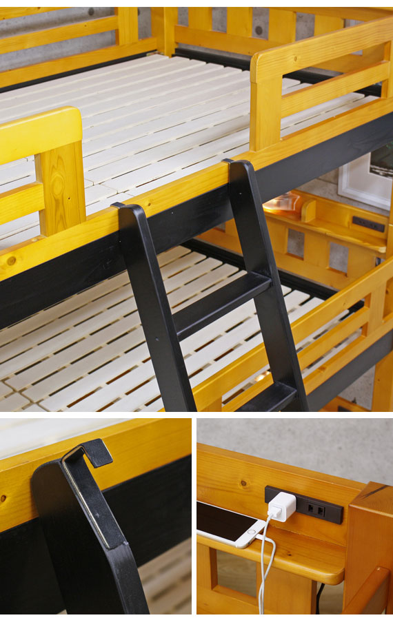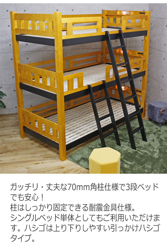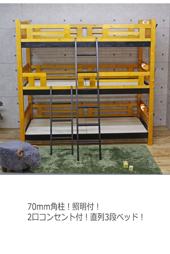 70mm角柱!照明付!2口コンセント付!直列3段ベッド!