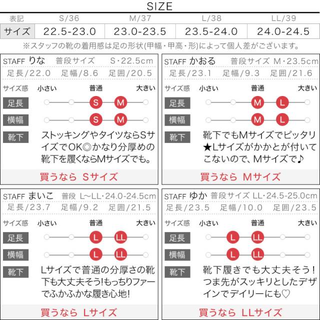 - 普段23.5〜24.0で スタッフさんの着用レビューを参考に Mを色違いで2足購入。 足あたりも柔らかくサイズもぴったしで おまけに暖かい!! レザーの方だと雨の日にちょっとだけ 外を歩くくらいなら平気だし ブーツは脱ぎ履きのある場所には面倒なので この冬の一番のお気に入りです??