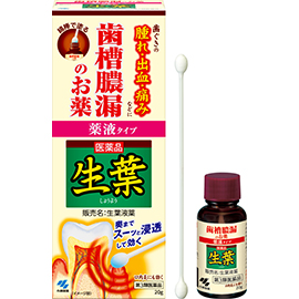生葉液薬です。歯茎の腫れ、うみ、痛み、むずがゆさ、口臭など歯肉炎、歯槽膿漏における諸症状、口内炎に優れた効き目があります。液体タイプなので、4つの有効成分を歯周ポケットにもすばやく行きわたらせ、効果的に作用し、優れた効き目を発揮します。歯茎にスーっとしみこむような爽やかな使用感です。医薬品。