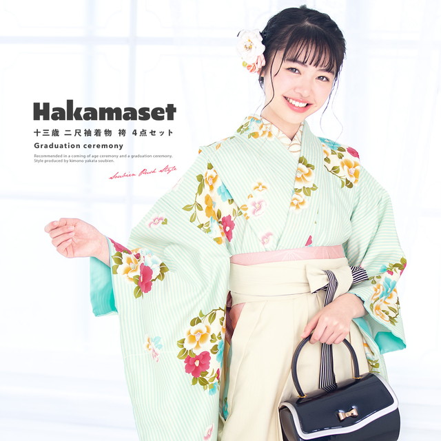 卒業式 袴セット 購入 小学生卒業式袴セット 女の子 小学生 袴 ジュニア ボヌールセゾン 水色 アイボリー 椿 縞 ストライプ 十三参り 十三詣り 13歳 小振袖 着物セット 送料無料