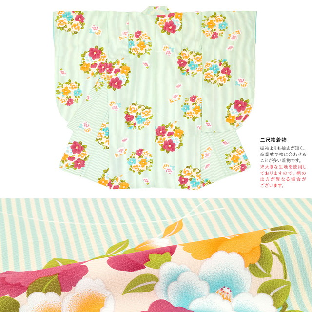 ※着物の柄部分は大きな生地を使用して作られておりますので、色や柄の出方、模様の配置等が画像と異なる場合がございます。