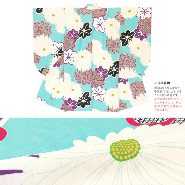 ※着物の柄部分は大きな生地を使用して作られておりますので、色や柄の出方、模様の配置等が画像と異なる場合がございます。