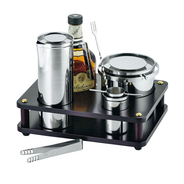 本格的な水割りセット。持ち運びが楽な専用木台付き。製造はステンレス加工の産地、新潟県燕市です。