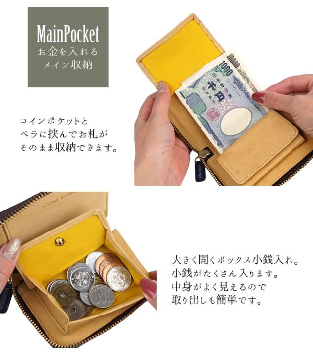キーケースのような大きさでお札と小銭、カードと全て収納できる多機能財布。素早く開くL字ファスナーがポイントです。