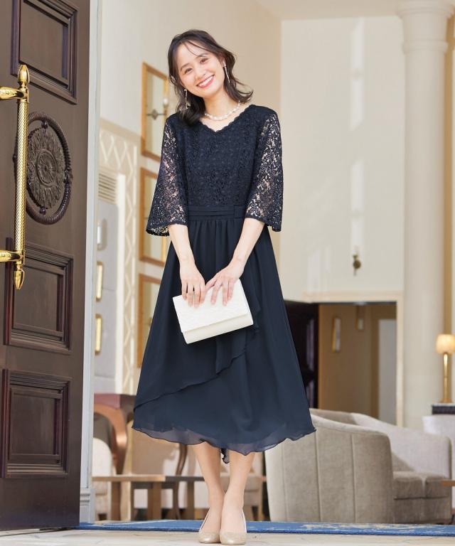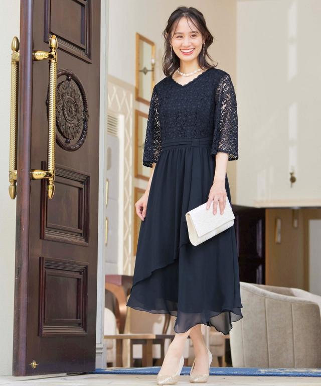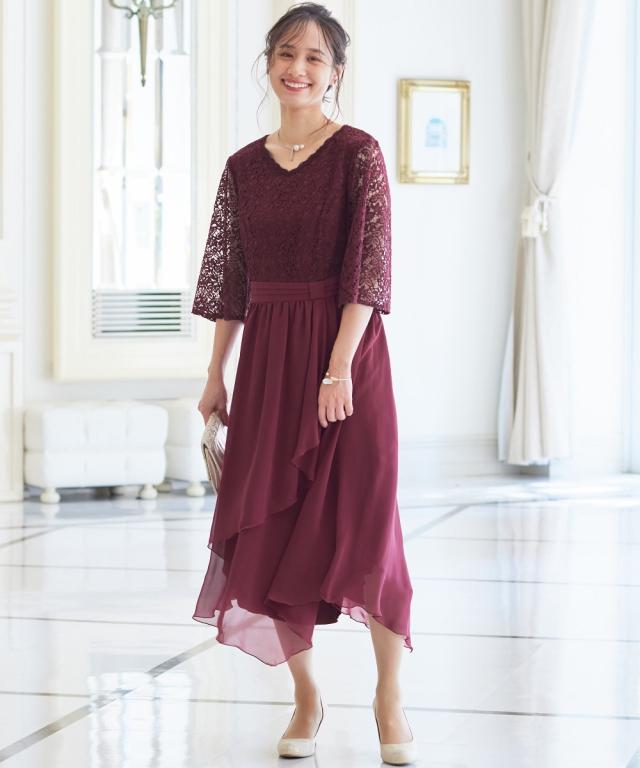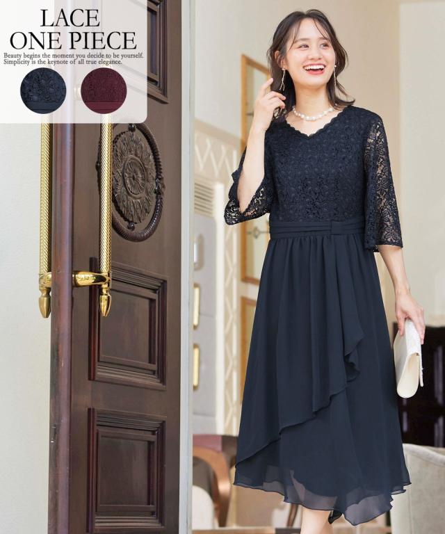ドレス パーティー レディース レース 使いイレギュラーヘム ワンピース フォーマル ネイビー/ボルドー S/M/L 結婚式 フォーマル 二次会 披露宴 謝恩会 同窓会 卒業式 パーティドレス 可愛い 大人 20代 30代 40代 体形カバー ニッセン nissen