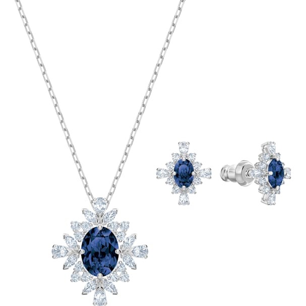 スワロフスキー『Palace セット』です。ラグジュアリーなスタイリングを楽しめるロジウムコーティングのネックレスとピアスのセットです。。ネックレスにはビンテージ風のカラーと魅力にあふれるデザインを取り入れました。抽象的な花のシェイプにあしらったきらめくクリスタルが風格のあるブルーのセンターピースを美しく引き立てています。シンプルなブルーのクリスタルが特徴のピアスは派手さを抑えたスタイルが魅力な作品です。