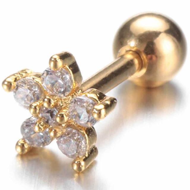 高級感のあるゴールドコーティングとクリアのキュービックジルコニアが小さいながらも存在感を発揮してくれるボディーピアスです。メンズでもレディースでも使えるおしゃれなバーベルボディピアスはペアルックやプレゼントにも最適です。男の人でも女の人でも使えるボディピアス。デザインが小振りでシャフトが真っ直ぐのストレートバーベルなので、ヘリックス(軟骨)やイヤーロブ(耳たぶ)はもちろん、トラガスやフォワードヘリックスやアッパーダイス、インナーコンク、アウターコンクなど様々なピアッシング部位に使えます。もちろん耳以外にもラブレットやリップなどの口ピアスなどに使っても綺麗。ネジボールを組み替えてカスタムしても面白い。