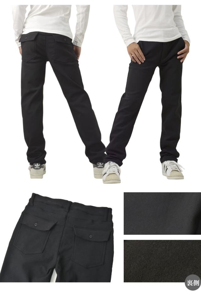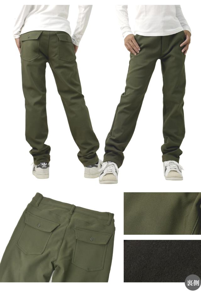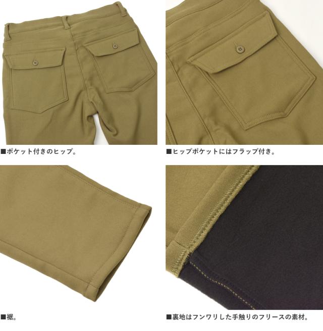 表は一見チノパン風、裏地はフンワリした手触りのフリースの素材。