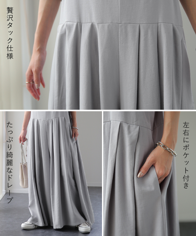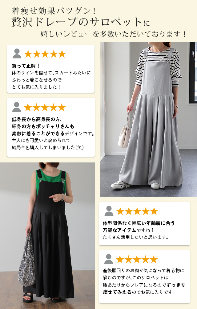 ワイドなシルエットと美しいドレープで、体型カバーに優れています。