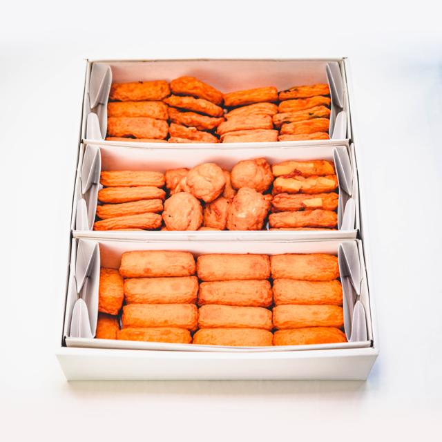 内容量/海鮮揚げ26本、いわし揚げ8本、人参ごぼう揚げ5枚、ニラ揚げ5枚、人参揚げ5枚、えび玉揚げ12個、さつまいも揚げ5枚、ごぼう揚げ5枚