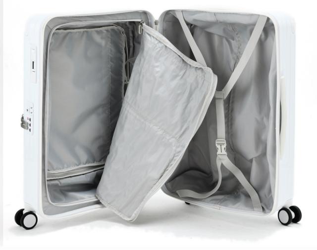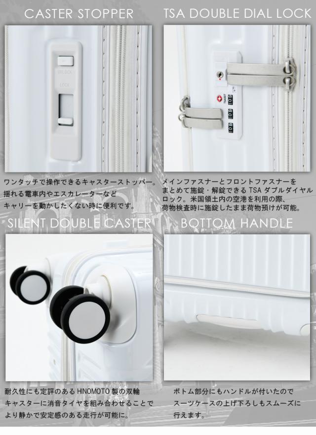 こちらは5-7泊程度の旅行に最適な60Lサイズで、様々なシーンで使い勝手の良いキャリー。サイレントダブルキャスターは、小回りがきいて移動もラクラク。ボトム部分にもハンドルが追加され、スーツケースの上げ下ろしもスムーズです。キャスターストッパー付きなので、揺れる電車やエスカレーターなどでその効果を発揮します。
