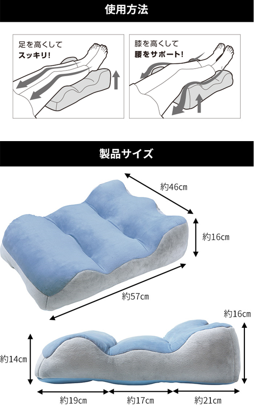 ・膝の下に入れ、軽く膝を曲げて寝ることで腰への負担が軽減され 腰が自然に伸びて寝姿勢をサポートします。
