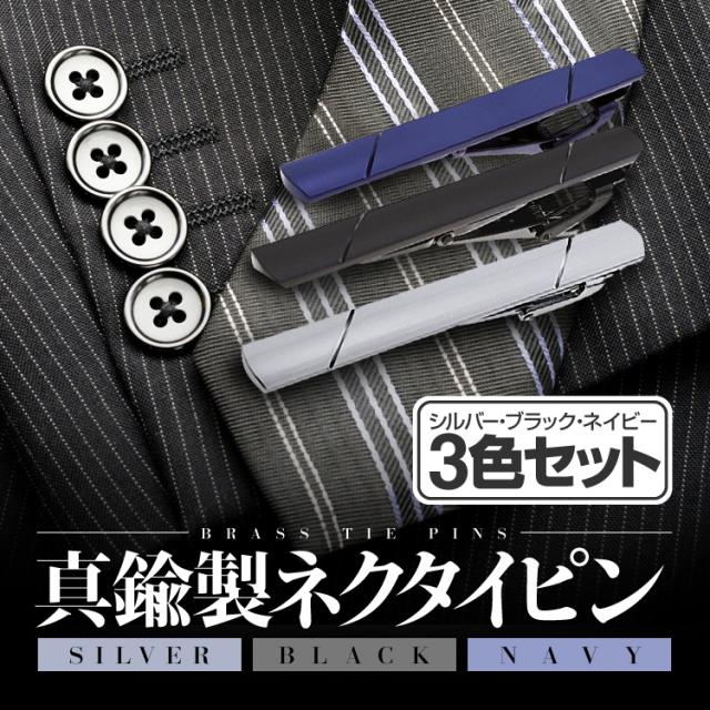 【3色セット】ネクタイピン 真鍮製 シルバー ネイビー ブラック 高級感 お洒落タイピン NEKPSET3