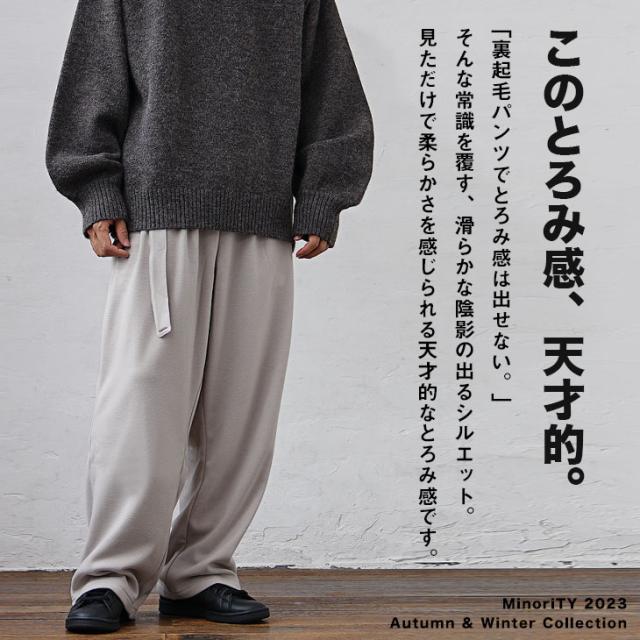 裏起毛パンツの常識を覆し、滑らかな陰影を作り出すとろみ感がある素材で見た目から柔らかな印象に。