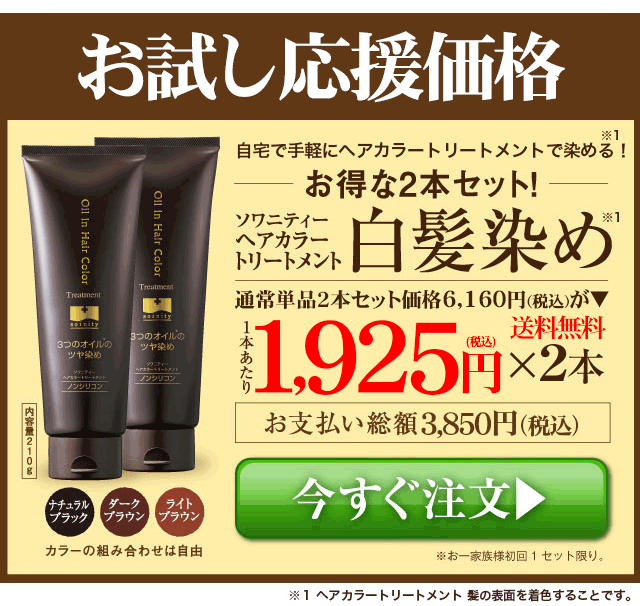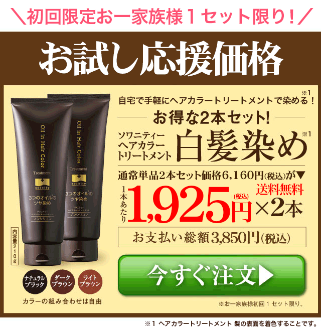 初回限定 お試し37%OFF! 白髪染め ソワニティーヘアカラートリートメント 210g 2本 セット 選べる3色 ブラック ダークブラウン ライトブラウン ※お一家族様1回限り 白髪 ノンジアミン ジアミンフリー