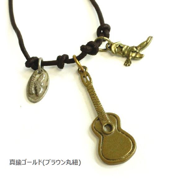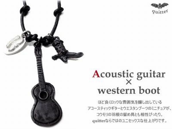 ヴィンテージ加工を施した牛革丸紐ネックに、アコースティックギターとウエスタンブーツのミニチュア、quitterネームトップを組み合わせました。