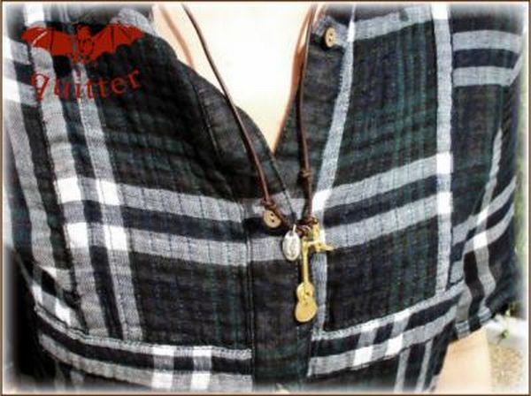 | ヴィンテージ加工を施した牛革丸紐ネックに、アコースティックギターとウエスタンブーツのミニチュア、quitterネームトップを組み合わせました。 ほどよくヴィンテージ感が出たロックな仕上がり♪ 留め具のレザーは魔除けや厄除けの意味がある、ブランドシンボルのコウモリの羽根をイメージしたデザイン☆ |