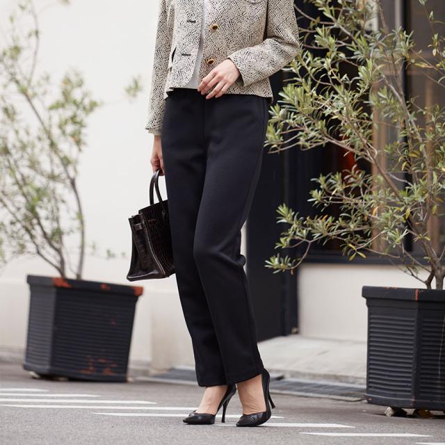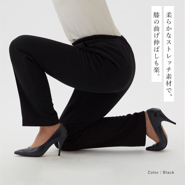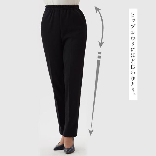 ヒップまわりにゆとりを持たせた脚長シルエットで、体型をきれいにカバー。総ゴム仕様でウエストらくらく、脱ぎはきもスムーズです。