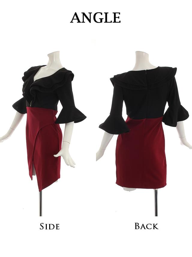 ☆カラバリ豊富なバイカラーミニドレスは五分袖で二の腕カバーができベルスリーブが手の動きを綺麗に見せてくれるタイトキャバドレス♪