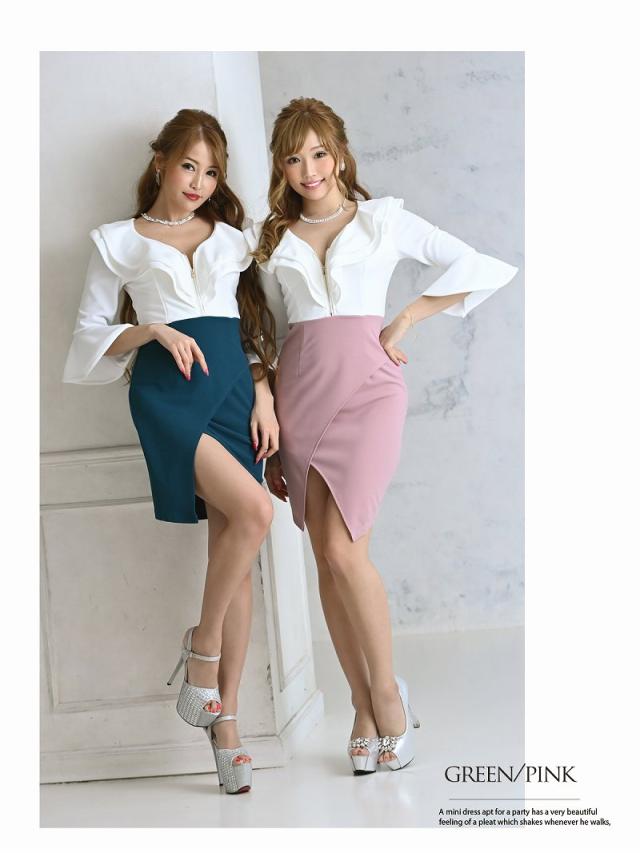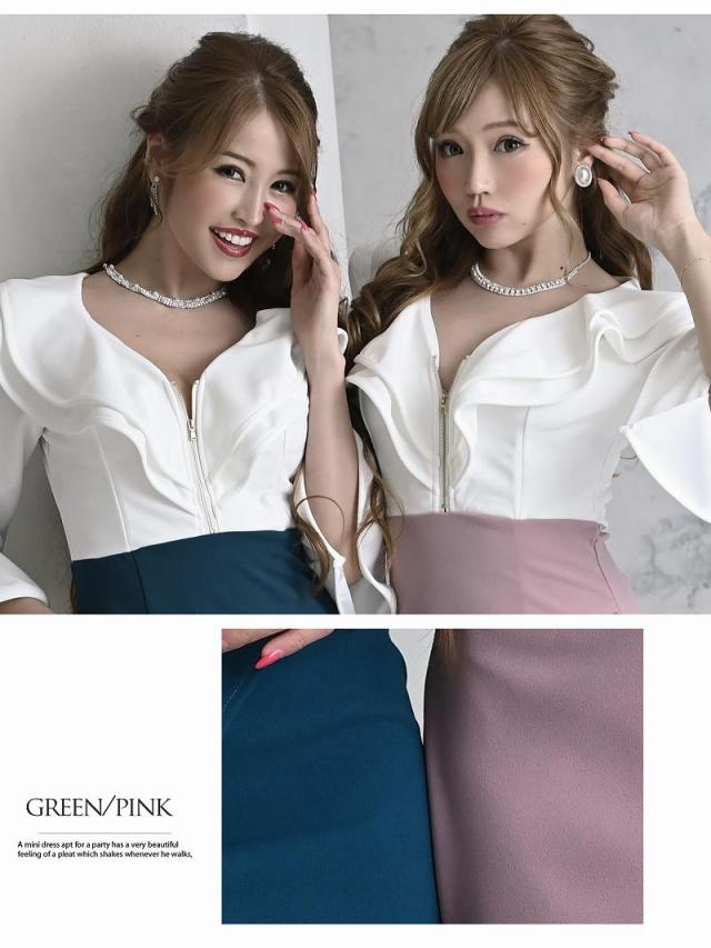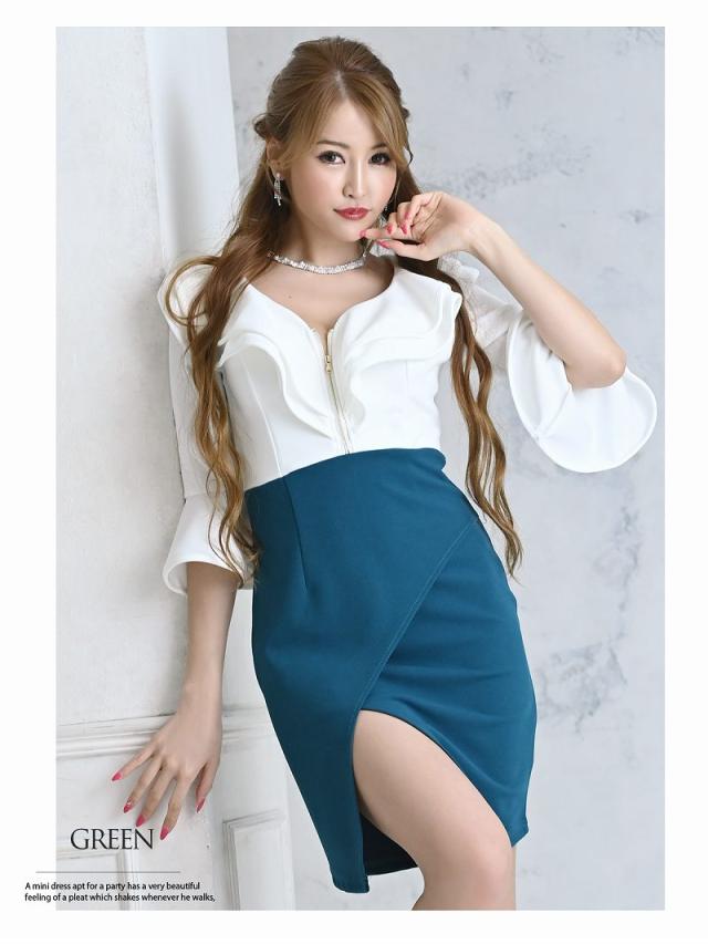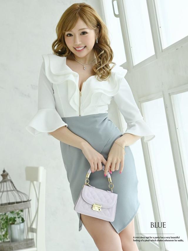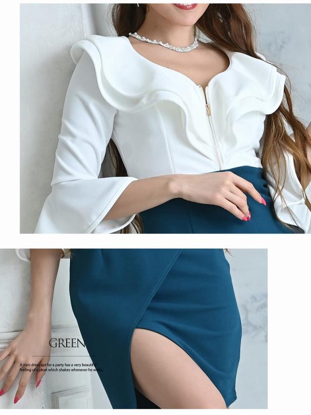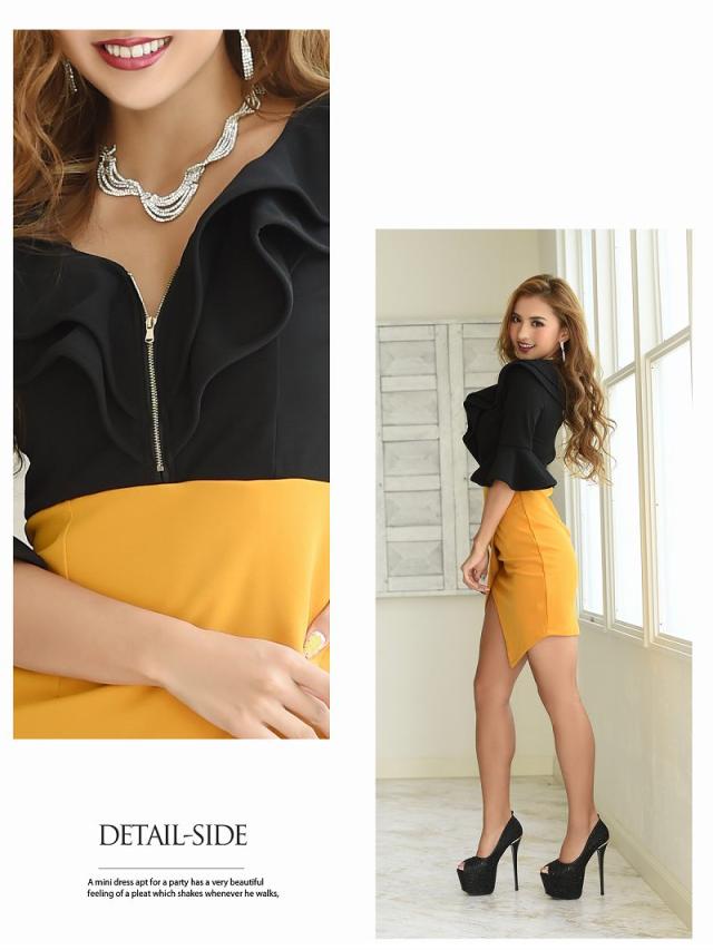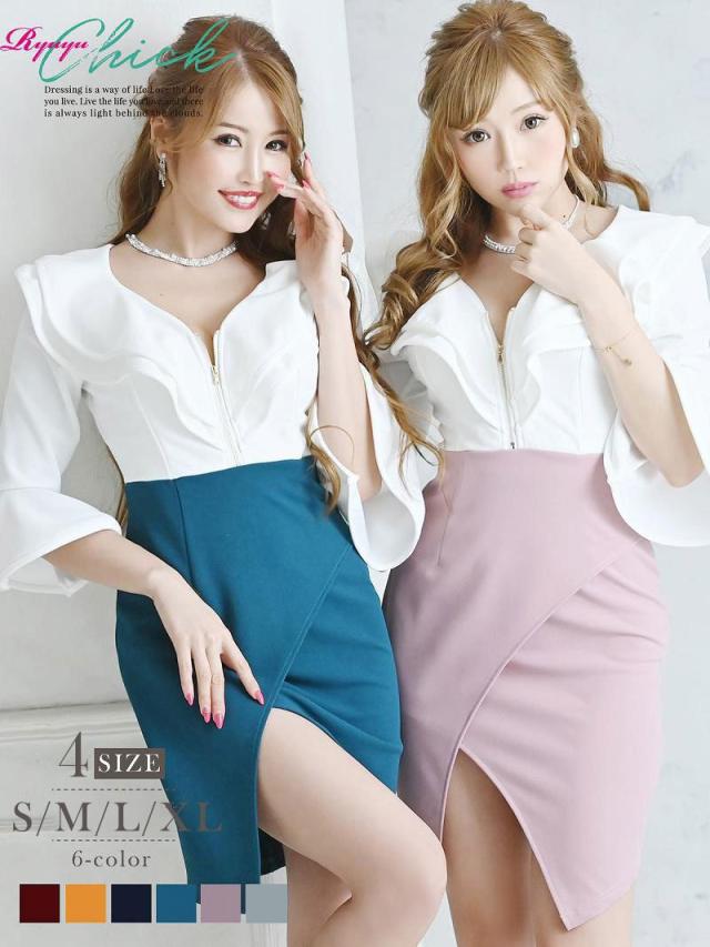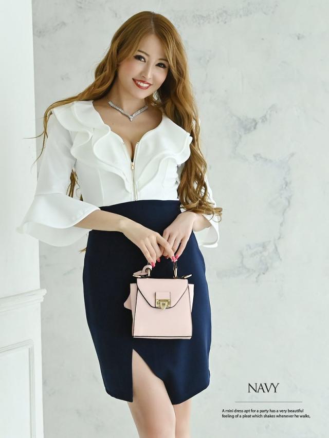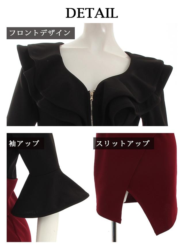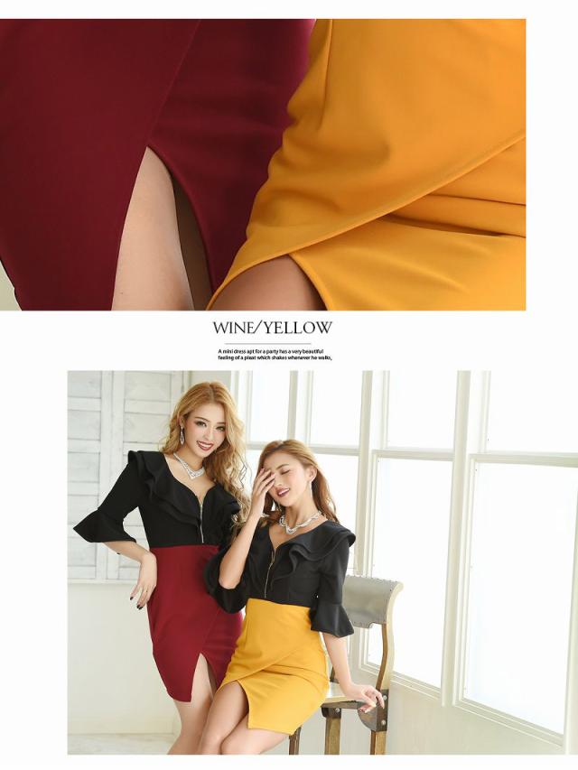 ☆開け閉め自由な胸元のジップで谷間魅せ出来る無地ドレスは胸元のフリルのデザインがセクシーさをプラスさせてくれるタイトキャバドレス♪