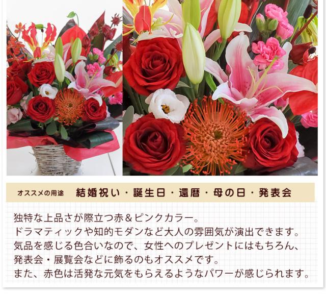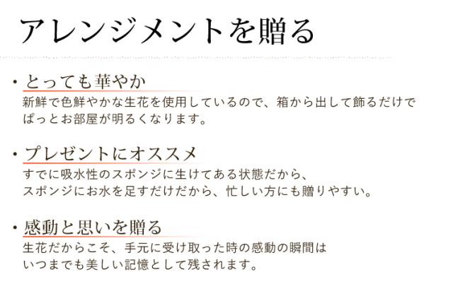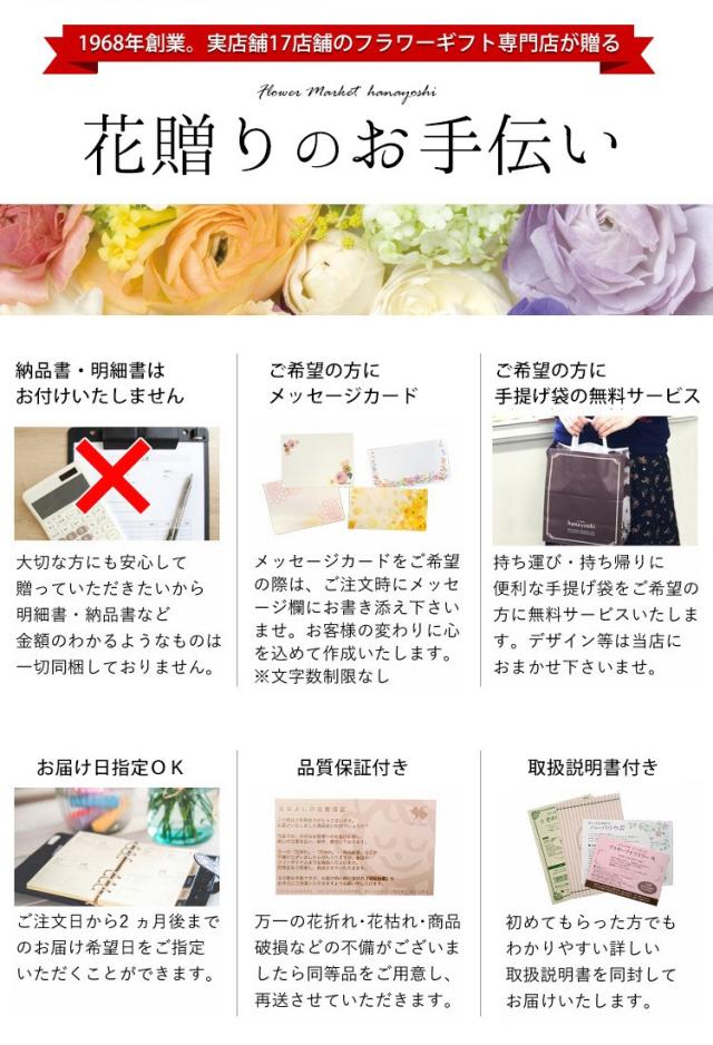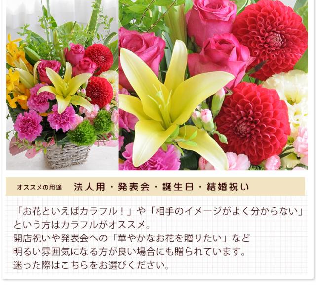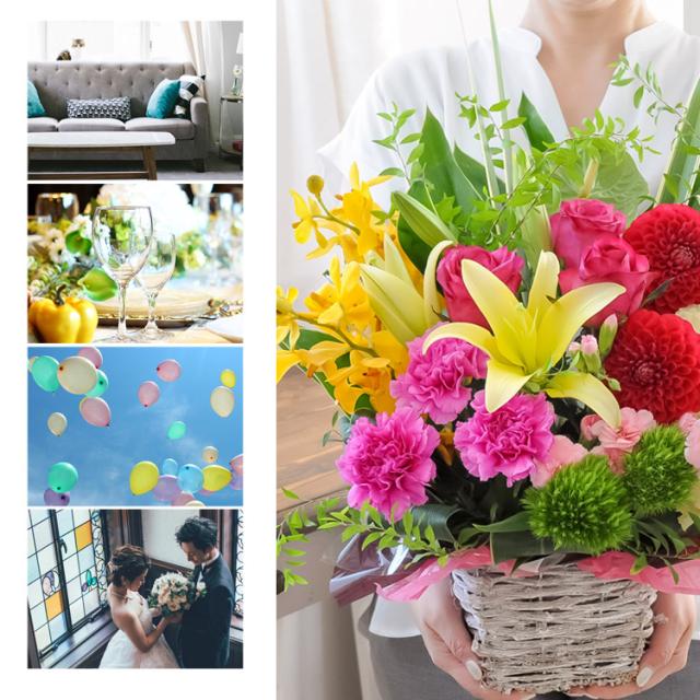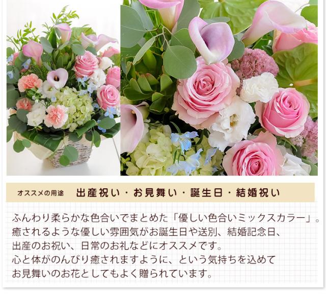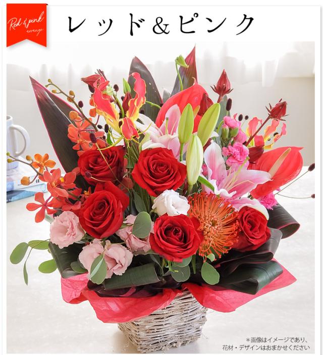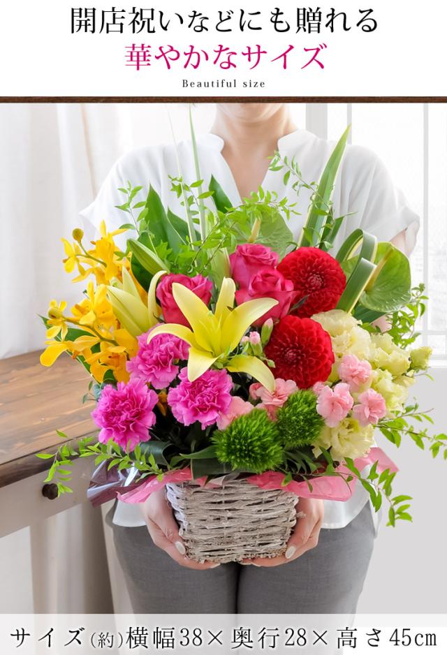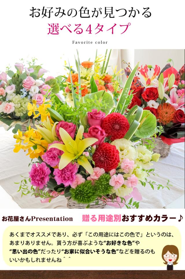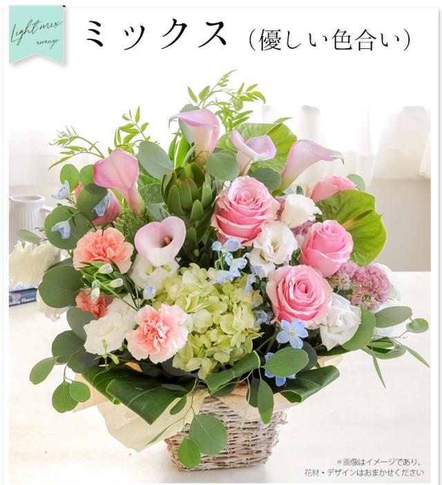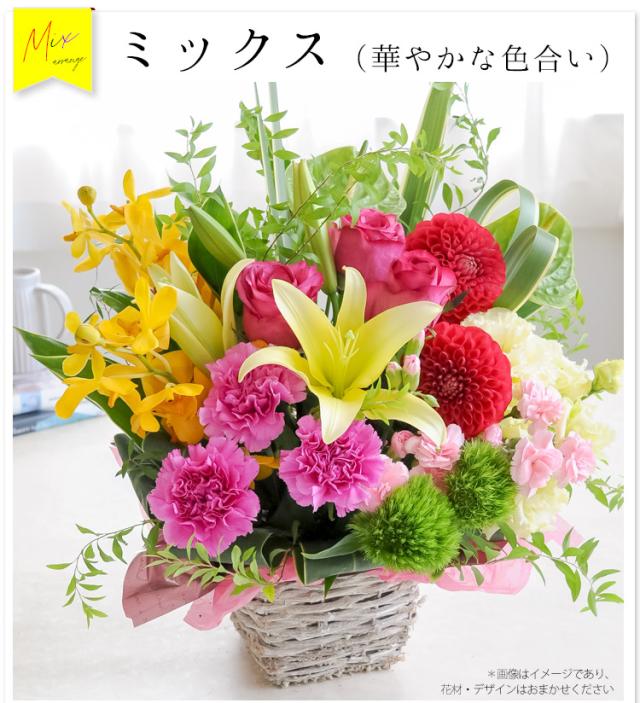 | 内容 | 季節の花各種、グリーン/バスケット(デザインおまかせ) / ラッピング/ お取扱い説明書 品質保証付きショップカード/ ●ご希望のお客様にはメッセージカード/手提げバッグ *入荷状況により資材が変わる場合がございます メッセージをご希望のお客様はお客様ご記入欄にメッセージをお書き添えください。 |