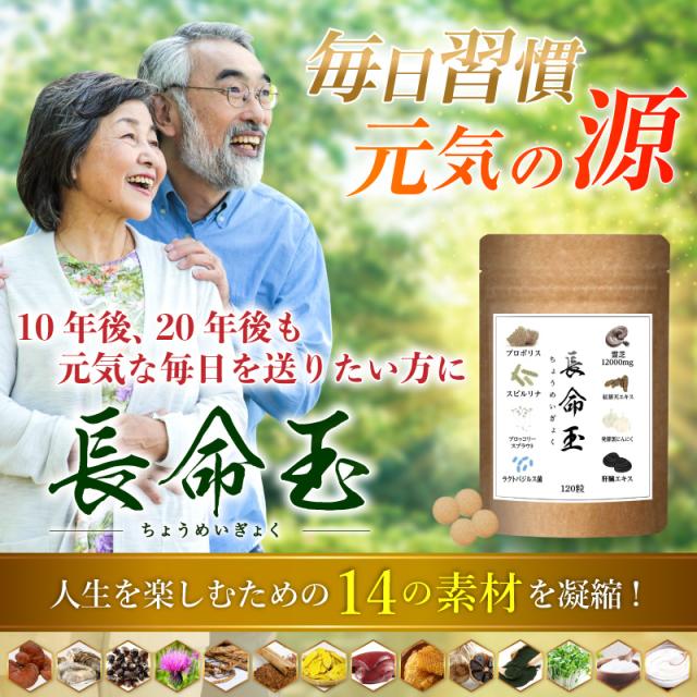 健康維持 元気 サプリ 霊芝 12000mg 高配合 乳酸菌 スピルリナ プロポリス 牡蠣 シジミ カキエキス ウコン アミノ酸 ブロッコリースプラウト 発酵 黒にんにく 健康 サプリメント 120粒 日本製 長命玉 送料無料